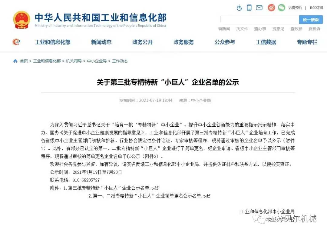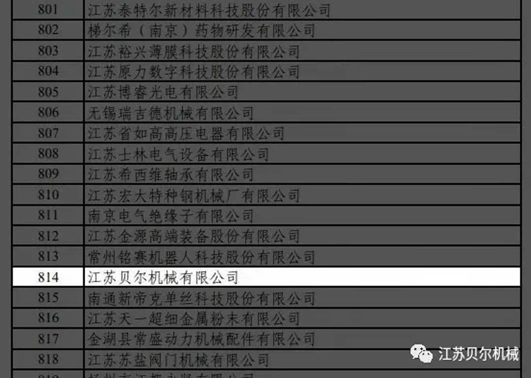 2021年7月19日,中国工业和信息化部公示了第三批专精特新“小巨人”企业名单,江苏贝尔机械有限公司成功上榜。