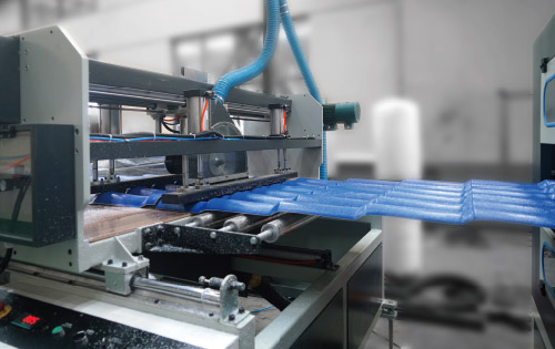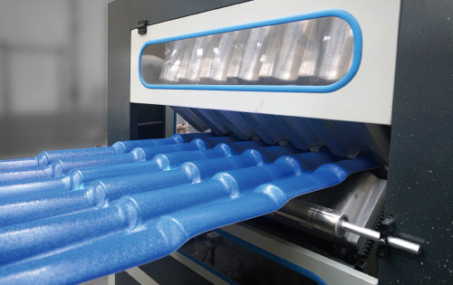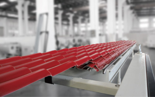 生产线主要用于PVC+ASA/PMMA琉璃瓦的生产,规格有宽度720mm、930mm、1100mm,厚度2、2.5、3mm。